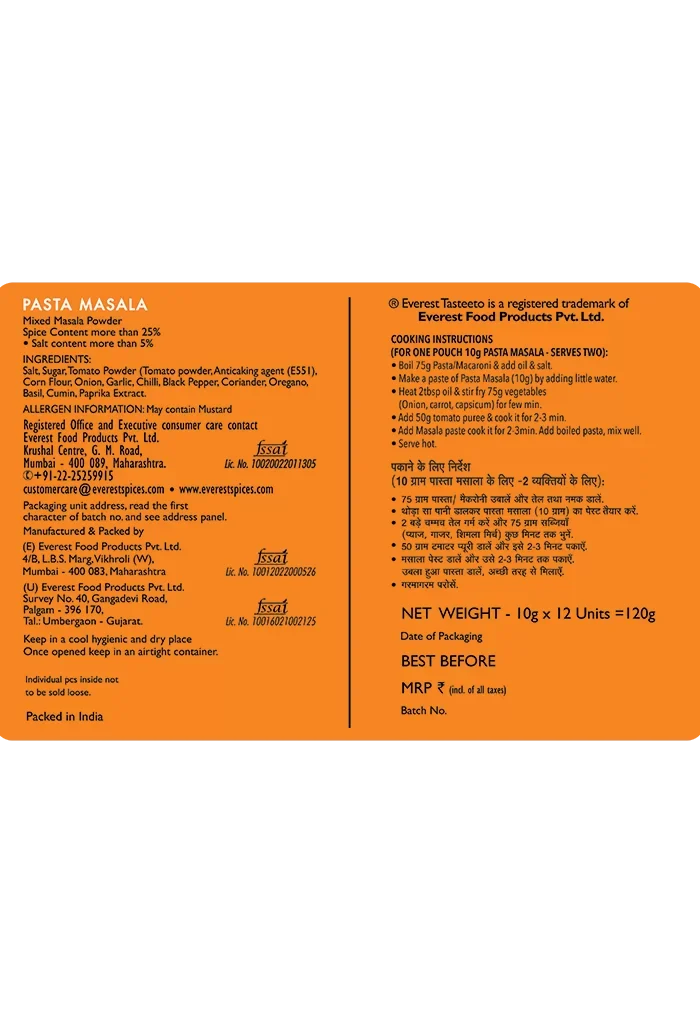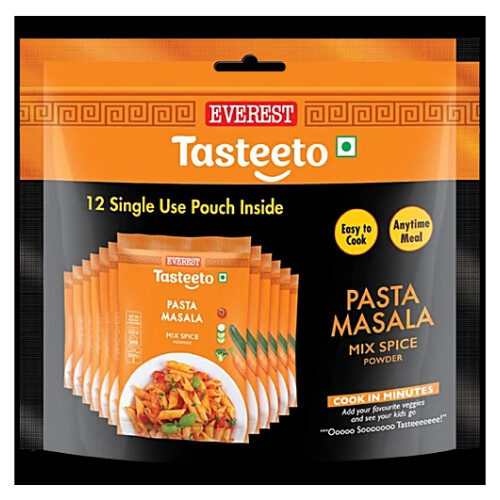 Everest Tasteeto?pasta?masala is a spice blend made from the choicest of ingredients that are picked in the right proportion, gently blended and coarse ground to unlock taste and aroma only while cooking. Just add your veggies and see your kids go ?Ooooo Sooooo Tasteeee