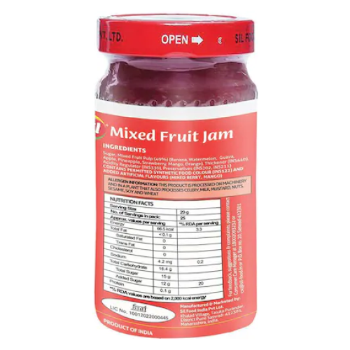 Sil Mixed Fruit Jam – a bright, sweet‑and‑tangy spread made from a blend of ripe fruits (think mango, pineapple, strawberry and orange) cooked down with sugar and a hint of natural pectin. It’s thick enough to spread on toast, swirl into yogurt, or dollop on desserts, and it stays good for months when stored in a cool, dry place. – Key ingredients: Mixed fruit puree, sugar, pectin, citric acid (for balance) – Taste: Sweet with a lively fruit zing, no artificial colours or preservatives – Uses: Toast, parathas, ice‑cream topping, glaze for cakes, mix into smoothies Date of Mfg/Packaging: 19-APR-2025        Shelf Life: 18-OCT-2026